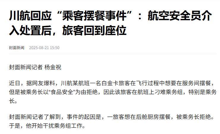 信源来源:封面新闻 2025-08-21 川航回应“乘客摆餐事件”:航空安全员介入处置后,旅客回到座位